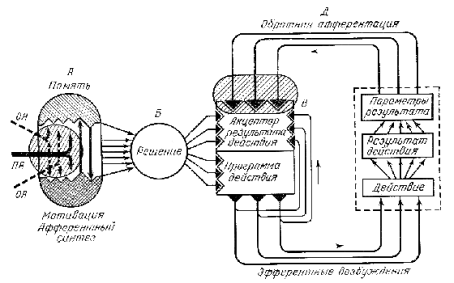 Рис. 9. Общая архитектура функциональной системы, представляющая собой основу «концептуального моста» между уровнями системных и аналитических процессов. А – стадия афферентного синтеза; ОА – обстановочная, ПА – пусковая афферентация; Б – принятие решения; В – формирование акцептора результатов действия и эфферентной программы самого действия; Г – Д – получение результатов действия и формирование обратной афферентации для сличения полученных результатов с запрограммированными.