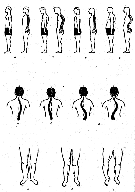 Нарушение осанки наблюдается при слабом физическом развитии (особенно в период роста и развития организма), при заболеваниях и травмах костно-мышечной системы, при переутомлении. При правильной осанке у хорошо физически развитого человека голова и туловище находятся на одной вертикали, грудная клетка приподнята, нижние конечности выпрямлены в тазобедренных и коленных суставах. При неправильной осанке голова слегка наклонена вперед, спина сутула, грудь плоская или впалая, живот выпячен.