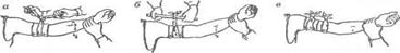 Рис. 9.3. Остановка кровотечения закруткой: а — затягивание узла; б —закручивание с помощью палочки; в — закручивание палочки