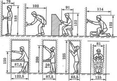 . Минимальное пространство рабочего места, необходимое для выполнения работы при различных положениях тела, указано на рис. 3.7.