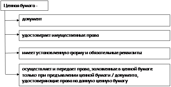 Рассмотрев фундаментальные свойства ценной бумаги, дадим ей определение с экономической точки зрения. Итак, ценная бумага – это форма существования капитала, отличная от его товарной, производственной и денежной форм, которая может передаваться вместо него самого, обращаться на рынке как товар и приносить доход. [2]