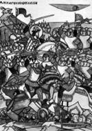 Через два года на Новгород двинулись рыцари меченосцы, но и они были разбиты князем Александром Невским на льду Псковского озера. По преданию, святому князю и его соратникам было видение небесного воинства. Князь выступил навстречу немцам и остановился недалеко от берега на льду. Рыцари, закованные в тяжелые латы, наступали плотным строем, но русские их окружили, многих перебили и взяли в плен. Битва эта получила название «Ледового побоища». Произошла она 5 апреля 1242 года.