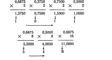 Пример перевода десятичной дроби 0,6875 в двоичную, восьмеричную и шестнадцатеричную системы счисления: