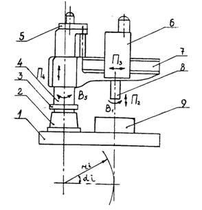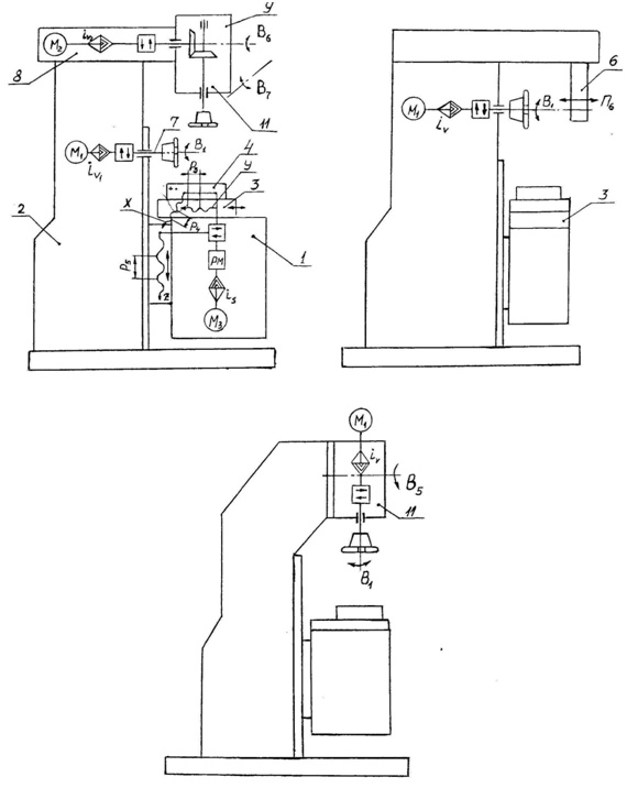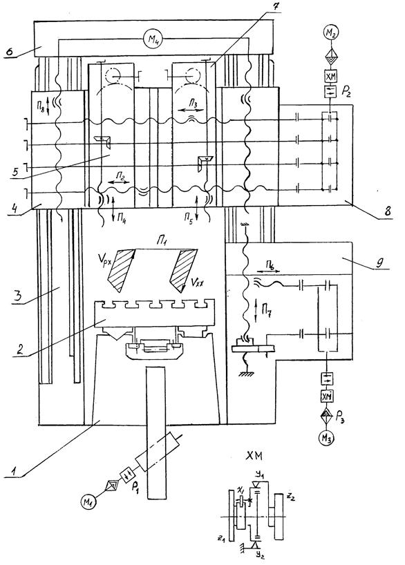 Движения подачи - прерывистые поступательные перемещения вертикальных суппортов в поперечном (П2; П3), вертикальном (П4;П5) и наклонном направлениях и бокового суппорта 9, ввертикальном (П7) и горизонтальном (П6) направлениях.
