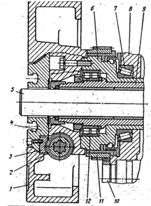 1 – корпус; 2 – червяк; 3 – рейка червяка; 4 – радиальный суппорт; 5 – расточный шпиндель; 6 – шпиндель, несущий планшайбу; 7 – конический роликоподшипник; 8 – шпиндельная бабка; 9 – полый шпиндель; 10, 11 – зубчатые колёса; 12 – роликоподшипник.