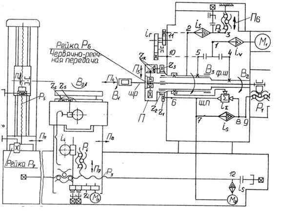 Движение подачи: осевая подача шпинделя П2; радиальная подача расточного суппорта планшайбы П3, продольная и поперечная подачи стола (П4; П5), вертикальная подача шпиндельной бабки П6. При нарезании резьбы резцом (в крайне редких случаях), закрепленным на расточном шпинделе, коробка скоростей iv соединяют с коробкой подач 3 с помощью гитары сменных колес iг.