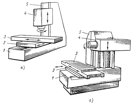 Бесконсольные вертикальные и горизонтальные фрезерные станки (рис.4.4) отличаются тем, что в вертикальном направлении по направляющим стойки 5 перемещается шпиндельная бабка 4. А салазки 2, несущие стол 3 перемещаются только в горизонтальной плоскости по направляющим станины 1 (крестовый стол). При такой компоновке значительно повышается жесткость станка. Такие станки целесообразно использовать при обработке крупногабаритных заготовок торцовыми фрезами.