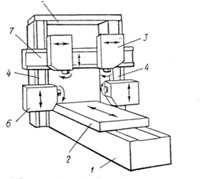 Эти станки предназначены для обработки плоскостей крупногабаритных деталей в основном торцовыми фрезами. Поэтому их стол 2 имеет лишь одну степень свободы – перемещается прямолинейно по направляющим станины 1, остальные движения сообщаются шпиндельным головкам. Главным движением в станке является вращение шпинделей. Продольно-фрезерные станки по компоновке отличаются числом стоек (4) и фрезерных головок (3). Есть одностоечные и двухстоечные станки без поперечины. У них на каждой стойке находится одна головка. Большинство станков с поперечиной 6 на двух стойках. Число фрезерных головок разное от 1 до 4.