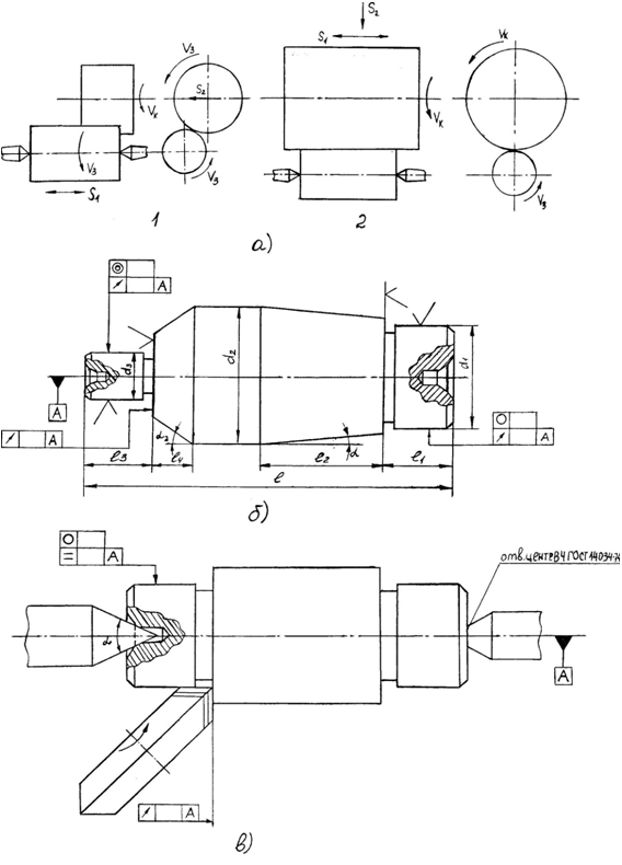 Типовые поверхности, обрабатываемые на круглошлифовальных станках, показаны на рис.6.1б, а схема обработки цилиндрической и торцевой поверхностей - на рис.6.1в.