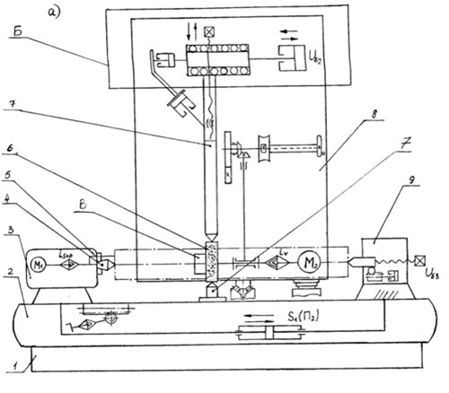 Рис. 6.2а. Компоновка и кинематическая структура круглошлифовального станка: 1 – станина, 2 – стол, 3 – передняя бабка, 4 – центр, 5 – поводковый патрон, 6 – шлифовальный круг, 7 – алмазодержатель, 8 – шлифовальная бабка, 9 – задняя бабка, Б – устройство для правки круга, В – устройство для балансировки круга.