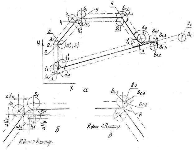 Для концевого инструмента это центр основания, для резцов — настроечная точка В или центр закругления Ц (см. рис. 2.5), для инструмента, диаметр которого изменяется (уменьшается) при переточках — ось инструмента. Траектория центра в плоскости обработки в большинстве случаев представляет собой линию, эквидистантную (равно отстоящую на величину Ru) к обрабатываемому контуру. Эквидистанта — геометрическое место точек, равноудаленных от контура детали на расстояние, равное радиусу Rи инструмента. В микропроцессорных системах УЧПУ третьего поколения программирование может вестись непосредственно по чертежу детали, т. е. выполняется безэквидистантное программирование. При этом расчеты, связанные с вычислением эквидистантного контура, выполняются в них автоматически. Действительный диаметр инструмента учитывается за счет введения; коррекции на радиус инструмента с пульта УЧПУ. Однако, если понимать отличие эквидистантного контура от контура детали, легче определить погрешности обработки, обусловленные неточностью задания УП.
