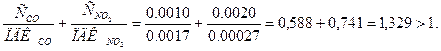 Используя соотношение (1) определим, соответствует ли допустимому их комплексное воздействие, если известно, что концентрация угарного газа в воздухе С СО =0,0010%,а двуокиси азота