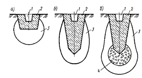 Рис. 12.8. Схемы устройства методом вытрамбовывания котлованов фундаментов с плоской подошвой (а), с заостренной подошвой обычного типа (б) и с уширенным основанием (в):
