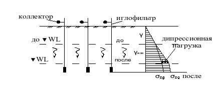 Рис. Схема уплотнения грунтов с помощью водопонижения иглофильтрами