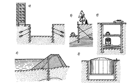 Рис.13.13. Конструкции, сооружаемые способом «стена в грунте»: а – котлованы в городских условиях; б – подпорные стенки; в – тоннели; г – противофильтрационные диафрагмы; д – подземные резервуары
