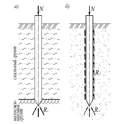 Свая, находящаяся в грунте, может передавать нагрузку от сооружения либо через нижний конец (пята), либо совместно с боковой поверхностью сваи за счет трения последней об грунт.