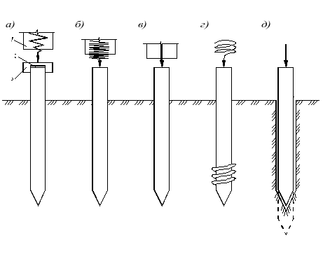 а – забивка; б – вибропогружение; в – задавливание; г – завинчивание; д – погружение в лидер (в очень плотных грунтах, промерзших грунтах); 1 – молот; 2 – металлический оголовок; 3 – деревянная или резиновая прокладка (для смягчения удара)