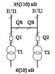 При мощности трансформаторов до 16 МВА применяются, в основном, подстанции 35-110/6(10) кВ с двухобмоточными трансформаторами. Одним из первых проектных решений для таких подстанций были подстанции типа 35-4 и 110-4, выполненные по упрощенной блочной схеме без выключателей на стороне высшего напряжения с неавтоматической (ремонтной) перемычкой на стороне высшего напряжения.