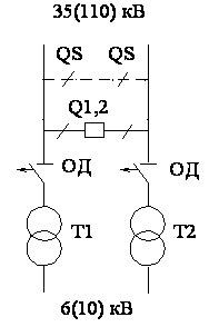 Подстанции типа «35(110)-4» содержат два блока с отделителями (ОД) и короткозамыкателями (КЗ) и неавтоматическую ремонтную перемычку c разъединителями QS со стороны питающих линий Л1 и Л2 (рисунок 1.1). На подстанции энергосистемы ЭС в «голове» питающих линий установлены выключатели Q1 и Q2.