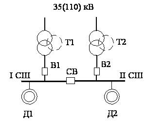 У схемы ЗРУ-6(10) кВ по рисунку 1.6 два недостатка. Первый - при большой мощности трансформаторов Т1 и Т2 их сопротивление становится настолько малым, что ток КЗ на шинах 6(10) кВ может превысить допустимые значения. Второй недостаток – в схеме по рисунку 1.6 не ограничиваются токи подпитки, посылаемые в точку КЗ электродвигателями Д1 и Д2. При выключенном вводном выключателе В1 или В2 и включенном секционном выключателе СВ в месте КЗ будет протекать ток подпитки от всех рабочих электродвигателей 1-й и 2-й секций шин (СШ). Как уже отмечалось выше, ток подпитки от одного электродвигателя примерно равен его пусковому току. При мощности 4000 кВт и напряжении 6 кВ пусковой ток равен примерно 430 А (таблица 1.1). При кратности пускового тока 8.0 ток подпитки от одного электродвигателя будет порядка 3440 А При трех рабочих электродвигателях ток подпитки будет 10320 А. При мощности электродвигателей 8000 кВт ток подпитки от электродвигателей может достигать 20 кА и более. В точке КЗ этот ток суммируется с током, посылаемым в точку КЗ энергосистемой. Поэтому при большой мощности трансформаторов Т1 и Т2 либо при большой мощности электродвигателей МНА (4000 кВт и более) в схеме 1.6 могут потребоваться дополнительные мероприятия по ограничению токов КЗ..