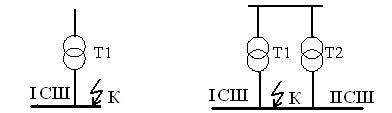 Одновременное включение всех трех выключателей допускается только во время оперативных переключений при выводе в ремонт одного из трансформаторов. При включенном СВ и КЗ в сети 6(10) кВ трансформаторы оказываются соединенными параллельно (рисунок 1.7, б) и ток КЗ в сети 6(10) кВ может возрасти примерно в два раза.