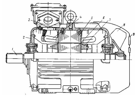1-вал; 2-подшипниковый щит; 3-корпус статора; 4-обмотка статора; 5-сердечник статора; 6-сердечник ротора; 7-обмотка ротора (короткозамкнутая);8-вентилятор; 9-кожух вентилятора