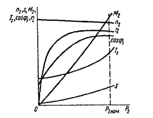 Рабочие характеристики. Изменение различных электрических и механических параметров двигателя в нормальном режиме описывается рабочими характеристиками, под которыми понимают зависимости n2, s,M2, I1 , cos