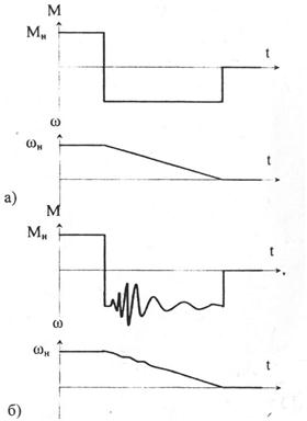 Рис.10 Графики изменения момента и угловой частоты от времени: а – при рекуперативном торможении; б – при смешанном торможении
