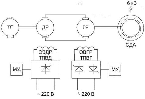 Рис.17 Функциональная схема электропривода ротора по системе генератор–двигатель: ТГ – тахогенератор постоянного тока; ДР – двигатель; ГР – генератор ротора, ОВДР – обмотка возбуждения двигателя; ОВГР – обмотка возбуждения генератора; ТПВД – тиристорный преобразователь возбуждения двигателя; ТПВГ – тиристорный преобразователь возбуждения генератора; МУ – магнитный усилитель; СДА – синхронный двигатель