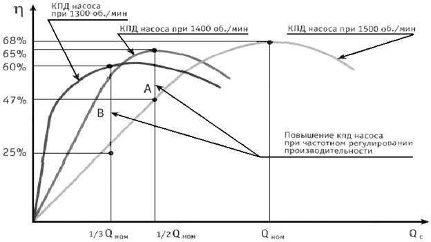 Рис.20– Изменение КПД насосного агрегата с частотным регулированием при изменении производительности