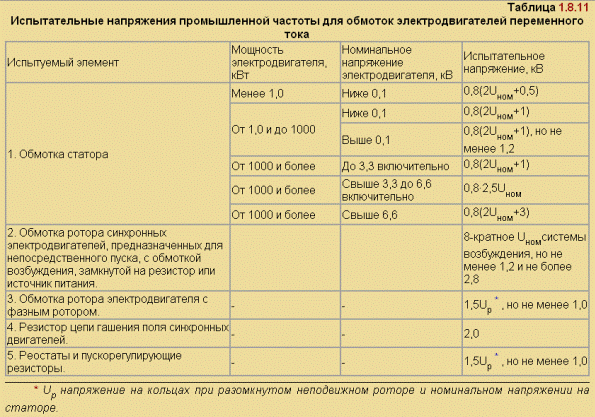4. Испытание повышенным напряжением промышленной частоты. Значения испытательных напряжений приведены в табл.1.8.11. Продолжительность приложения испытательного напряжения 1 мин.