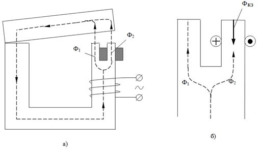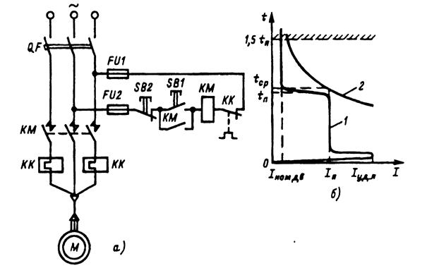 (б) - пусковая характеристика двигателя (1) и защитная характеристика теплового реле (2)
