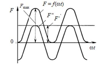 F = 0,5Fmax(1 – cos 2ωt) = Fср – 0,5Fmaxcos 2ωt. = F'– F' cos2ωt = F'– F".