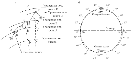 а – уровенные поверхности; б – геоид (сплошная линия) и эллипсоид (пунктирная линия)