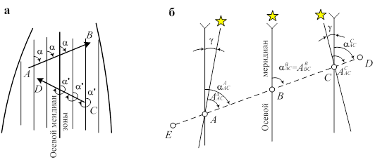 Из-за непараллельности географических меридианов, проходящих через различные точки одной и той же прямой, азимуты, определенные в ряде точек этой прямой, не равны между собой.
