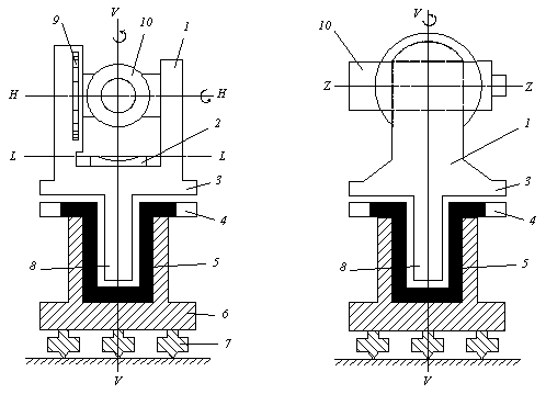 Ось вращения теодолита VV приводится в отвесное положение при помощи подъемных винтов 7 с использованием уровня 2, ось LL которого должна быть в горизонтальном положении, и который крепится или к алидаде горизонтального круга, или к колонке (подставке) зрительной трубы.