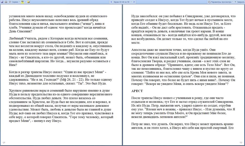 Режим чтения (рис.) предназначен для чтения документа на экране компьютера. Впрочем, в этом режиме можно также отображать документ в том виде, в каком он будет выведен на печать. Здесь можно и редактировать текст, делать пометки, добавлять примечания, работать в режиме записи исправлений, хотя все это используется редко.