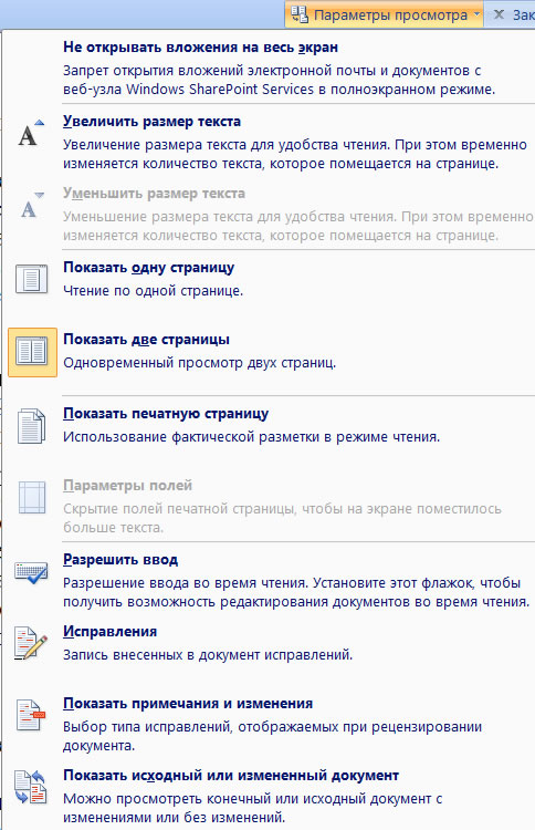 Для настройки параметров режима чтения щелкните по кнопке Параметры просмотра в верхнем правом углу экрана (рис.) и выберите соответствующую команду меню.