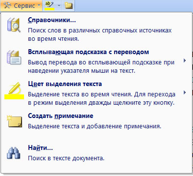 Некоторые дополнительные параметры режима чтения можно использовать, если щелкнуть по кнопке Сервис в верхнем левом углу экрана (рис.).