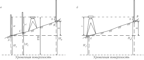 Для некоторой точки, находящейся внутри интервала АВ, например С (рис. 7.1, а) высота может быть определена с использованием горизонта нивелира, но для этого надо взять отсчет (в данном случае отсчет с) по рейке, установленной в точке С: