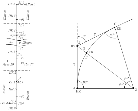 Для плавного поворота трассы в ее углы поворота вписывают кривые, представляющие чаще всего дуги окружности (рис. 8.2). Точки касания кривой с прямолинейными участками трассы называются началом кривой (НК) и концом кривой (КК), середина кривой обозначается СК. Указанные точки кривой НК, КК, СК называются главными точками кривой.