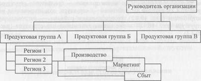 Дивизиональные структуры — это специфические виды структур бюрократического типа, в которых варьируются принципы межфирменного и межфункционального взаимодействия на основе линейно-функциональных связей. Но в силу специфического построения подразделений — либо с ориентацией на регион, либо на продукт, либо на потребителя — эти структуры весьма динамичны и близки к адаптивному типу. С увеличением размеров фирм, внедрением новых технологий, повышением изменчивости внешней среды происходит структуризация органов управления путем выделения управленческих звеньев, специализирующихся по видам товаров — продуктовая структура (рис. 4.6), группам потребителей — структура, ориентированная на потребителя (рис. 4.7), географическим районам — региональная структура (рис. 4.8) и смешанная дивизиональная структура (рис. 4.9).