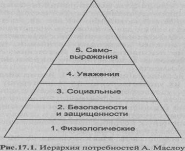 Иерархия потребностей по А. Маслоу. Теория, предложенная в 40-е годы психологом А. Маслоу, утверждает, что пять основных типов потребностей образуют иерархическую структуру (рис. 17.1), во многом определяющую поведение человека. А. Маслоу разделил потребности на первичные (физиологические, потребности в защите) и вторичные (потребности социальные, потребности в уважении и потребности в самовыражении и развитии). Согласно его теории пока слой первичных потребностей не удовлетворен, активными не станут потребности вторичного уровня.