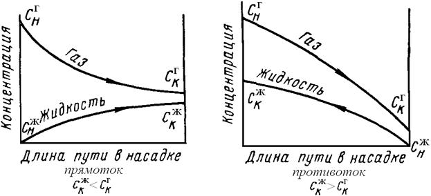 При противотоке процесс более уравновешен по длине аппарата, причём при этом достигается наибольшая полнота процесса (С