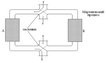 Горячий газ сначала проходит через регенератор А, нагревает его насадку, а сам охлаждается. Холодный газ проходит через регенератор Б и нагревается от ранее нагретой насадки. После нагрева насадки в А и охлаждения в Б заслонки перекрывают и т.д.