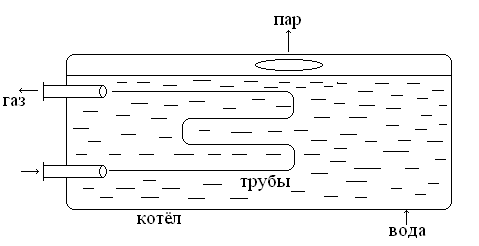 Горячие газы движутся по трубам, размещённым в корпусе котла. В межтрубном пространстве находится вода. Образующийся пар, проходя влагоотделитель, выходит из котла.