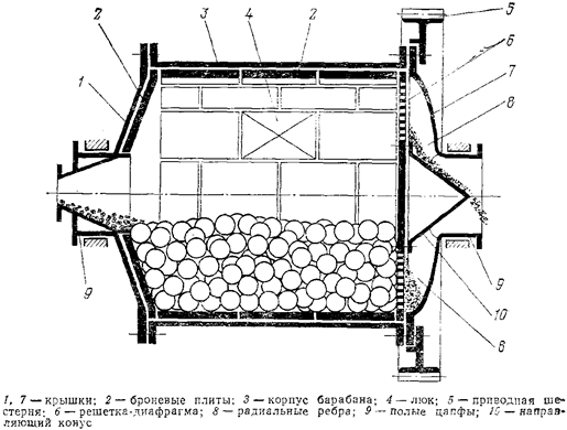 Основными рабочими элементами шаровых (барабанных) мельниц являются шары или стержни, находящиеся во вращающемся барабане.