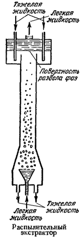 Представляет собой полую колонну, заполненную одной из жидкостей – сплошной (дисперсионной) фазой (на рисунке – тяжёлая жидкость). Для создания большей поверхности контакта фаз другая жидкость (дисперсная фаза) распыляется при помощи распределительного устройства в сплошной фазе. На определённом уровне капли дисперсной фазы сливаются образуют слой, отдельный от сплошной фазы поверхностью раздела. Сверху и снизу колонна расширена, что способствует лучшему отстаиванию фаз. Данные колонны обладают высокой производительностью, но мало эффективны.
