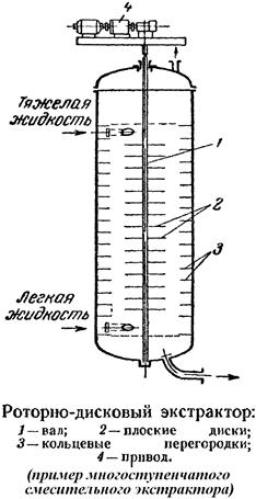 Наиболее распространённым аппаратом этого типа является роторно-дисковый экстрактор. По оси колонны вращается ротор-вал, на который насажены плоские диски 2, перемешивающие жидкость. Колонна делится на секции кольцевыми перегородками 3, укреплёнными на стенках аппарата, причём диски находятся на середине высоты каждой секции. Движущиеся противотоком жидкие фазы смешиваются в каждой секции и в некоторой степени разделяются при обтекании неподвижных кольцевых перегородок, ограничивающих секции. Производительность и эффективность зависит от числа оборотов ротора, соотношения размеров дисков и кольцевых перегородок и расстояния между ними, а также, как и в других экстракторах, от соотношения расходов фаз. Достоинством роторно-дисковых экстракторов является сочетание довольно значительной производительности с высокой интенсивностью процесса массопередачи.