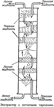 В экстракторах с ситчатыми тарелками дисперсная фаза многократно раздробляется при прохождении сквозь отверстия ситчатых тарелок (диаметр отверстий 2-9 мм). Струйки дисперсной фазы распадаются при этом на мелкие капли, которые образуют слои над тарелками, если диспергируется лёгкая жидкость. Диспергирование происходит, когда гидростатическое давление слоя жидкости становится достаточным для её прохождения сквозь отверстия. Для стока сплошной фазы на тарелках имеются сливные патрубки. Расстояние между тарелками составляет 0,15-0,6 м.
